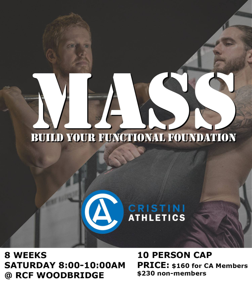 The “MASS” program  is a 2 hour strength program, ran by Coach Brandon Crump at RCF Woodbridge. You will be improving all aspects of strength, from weightlifting and powerlifting, to strong man and body building. Program starts July 15th and runs on Saturday’s at 8:00am-10:00am. Program also comes with 2 days a week of additional homework.  To register, go to https://clients.mindbodyonline.com/classic/ws?studioid=32045&stype=-8&sView=day&sLoc=0&sTrn=100000020